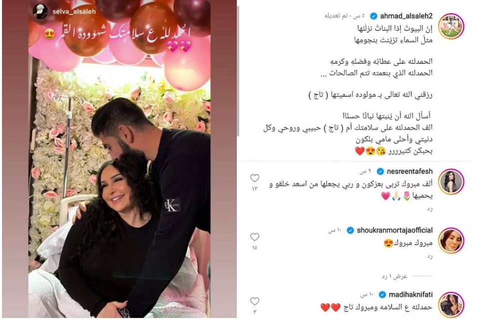 ونشر احمد الصالح عبر إنستغرام صورة تجمعه بطفلته قائلا : “إنّ البيوتَ إذا البناتُ نزلْنَها مثلُ السماءِ تزيّنتْ بنجومِها، الحمدلله على عطائِه وفضلهِ وكرمه، الحمدلله الذي بنعمته تتم الصالحات، رزقني الله تعالى بـ مولودة اسميتها (تاج)، أسأل الله أن يُنبتها نباتًا حسنًا”.