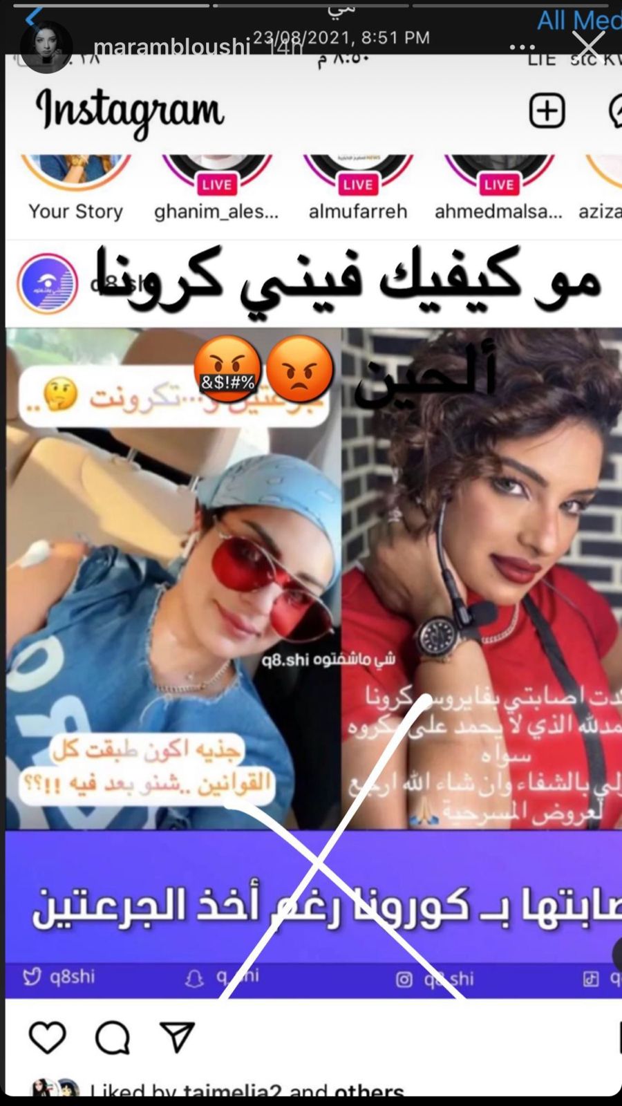 الجدير بالذكر ان مرام البلوشي قد اصيبت بفيروس كورونا في يوليو الماضي، حيث أعلنت عن إصابتها عبر حسابها الرسمي على موقع “إنستغرام.