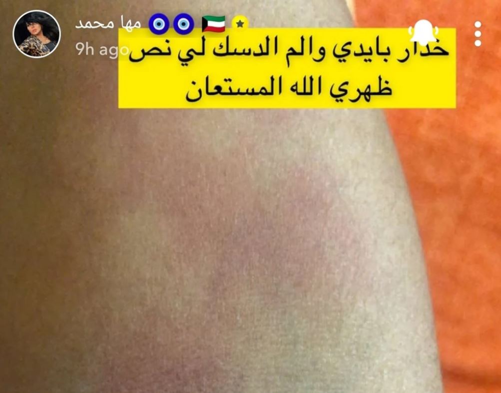 ووضحت من خلال صورة ثانية سبب دخولها المستشفى حيث كتبت :”خدار ياديى والم الدسك لي نص ظهري اله المستعان”.