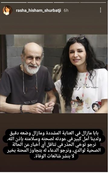 ونشرت عبر خاصية “الستوري” على “إنستغرام” صورةً جمعتها بوالدها، أكدت من خلالها أن وضعه دقيق وكتبت: “بابا ما زال بالعناية المشددة وما زال وضعه دقيق ولدينا أمل كبير في عودته لصحته وسلامته بإذن الله”.