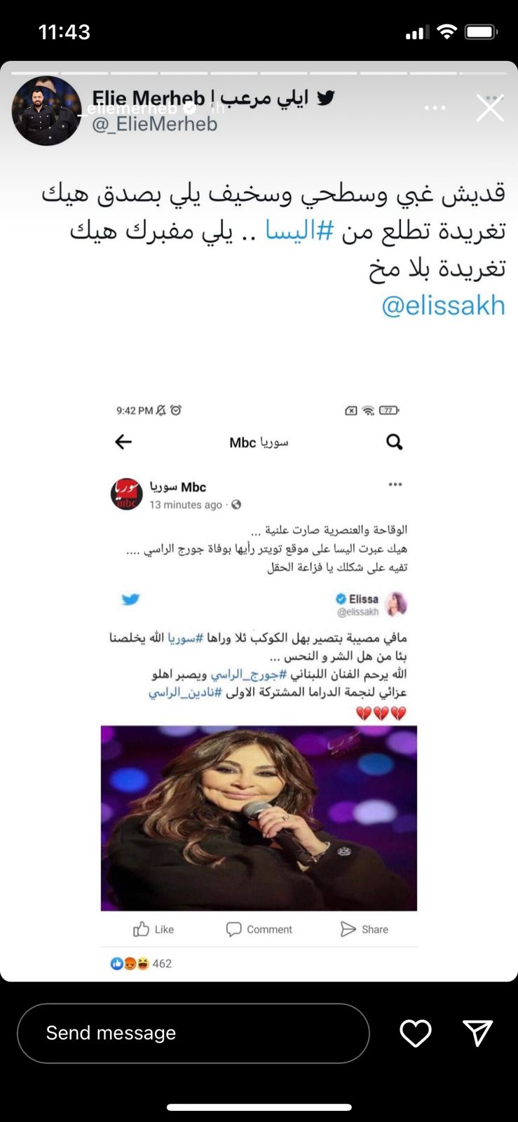 وفي التفاصيل، فقد تداول المتابعون عبر موقع تويتر تغريدة نسبت الى اليسا جاء فيها:”مافي مصيبة بتصير بهل كوكب ئلا وراها سوريا الله يخلصنا بئا من هل الشر والنحس، الله يرحم الفنان جورج الراسي ويصبر اهلو، عزائي لنجمة الدراما المشتركة الاولى نادين الراسي”