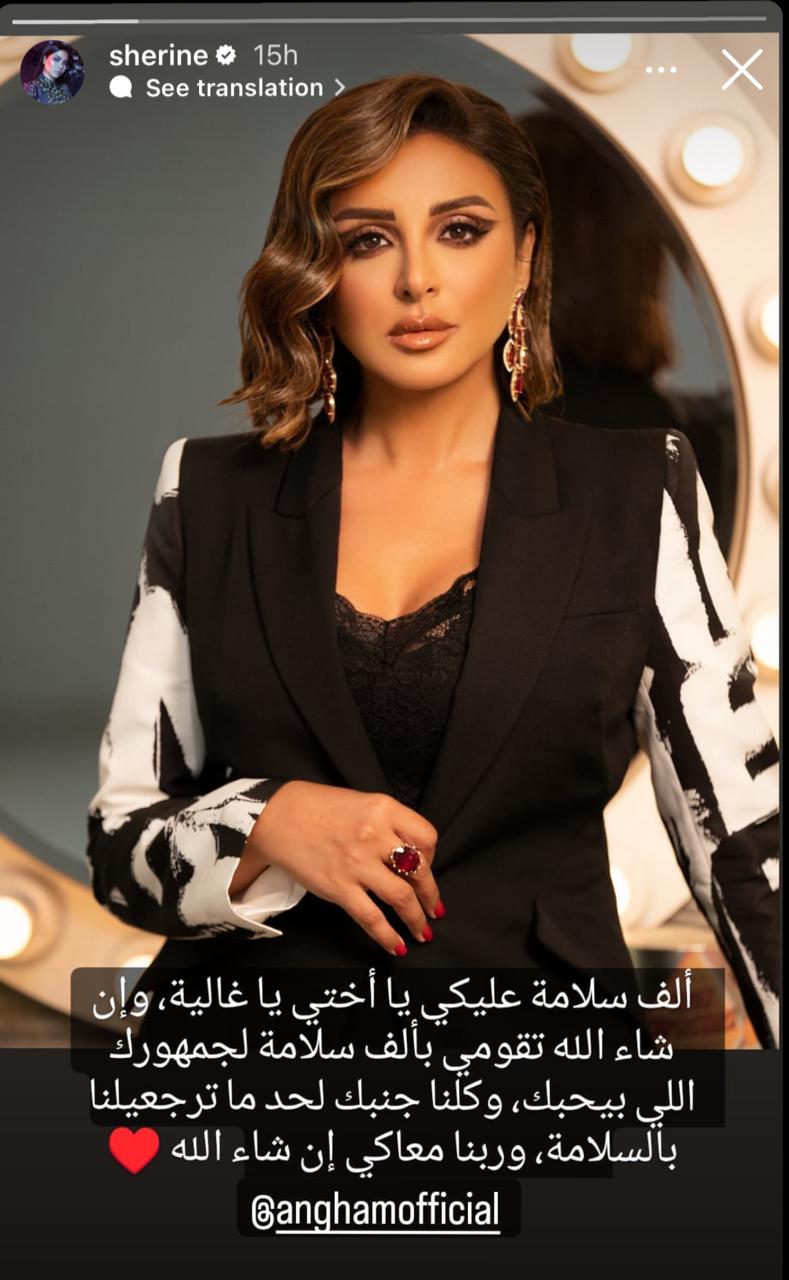 ونشرت شيرين عبد الوهاب صورة لـ أنغام ارفقتها بالتعليق التالي: “ألف سلامة عليكي يا أختي يا غالية وإن شاء الله تقومي بألف سلامة لجمهورك اللي بيحبك”، مضيفة: “كلنا جنبك لحد ما ترجعيلنا بالسلامة وربنا معاكي إن شاء الله”.