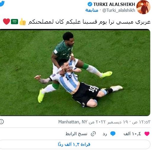 وجه رئيس الهيئة العامة للترفيه في المملكة العربية السعودية تركي آل الشيخ رسالة الى اللاعب الارجنتيني ميسي بعد فوزه على نظيره الفرنسي ضمن فعاليات كأس العالم.