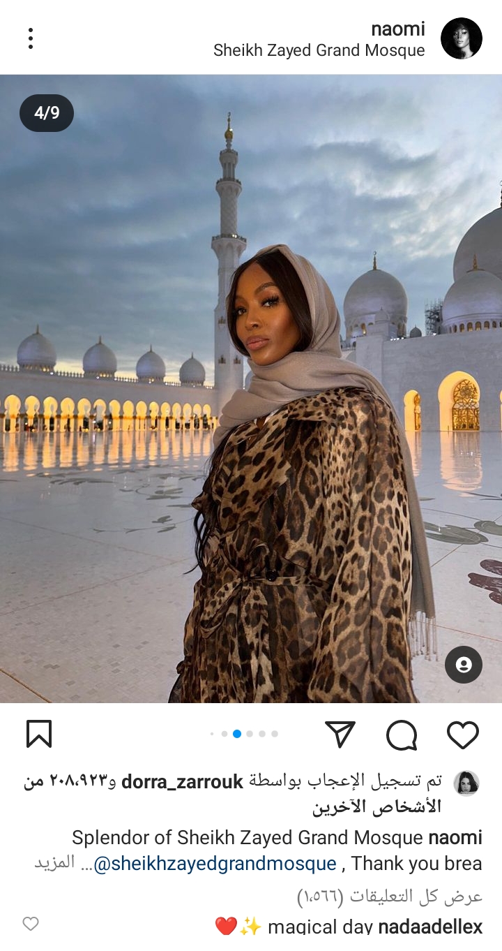 نشرت عارضة الأزياء البريطانية نعومي كامبل صورا لها، جمعتها بابنتها من داخل باخة”جامع الشيخ زايد الكبير” في العاصمة الإماراتية أبوظبي، حيث ظهرت وهي ترتدي الحجاب.