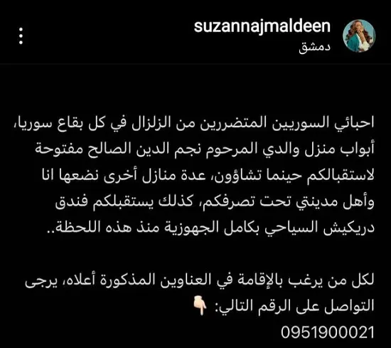 أعلنت الفنانة السورية سوزان نجم الدين فتح أبواب منزل والدها الراحل لمتضرري الزلزال المدمر، الذي ضرب تركيا وسوريا .