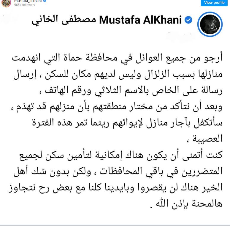 طلب نجم باب الحارة مصطفى الخاني من المتضررين من الزلزال المدمر في شمال سوريا إرسال رسالة له بالاسم الثلاثي ورقم الهاتف، حتى يستطيع المساعدة، مؤكدا أنه سيتكفل بدفع أجار منازل لإيوائهم .
