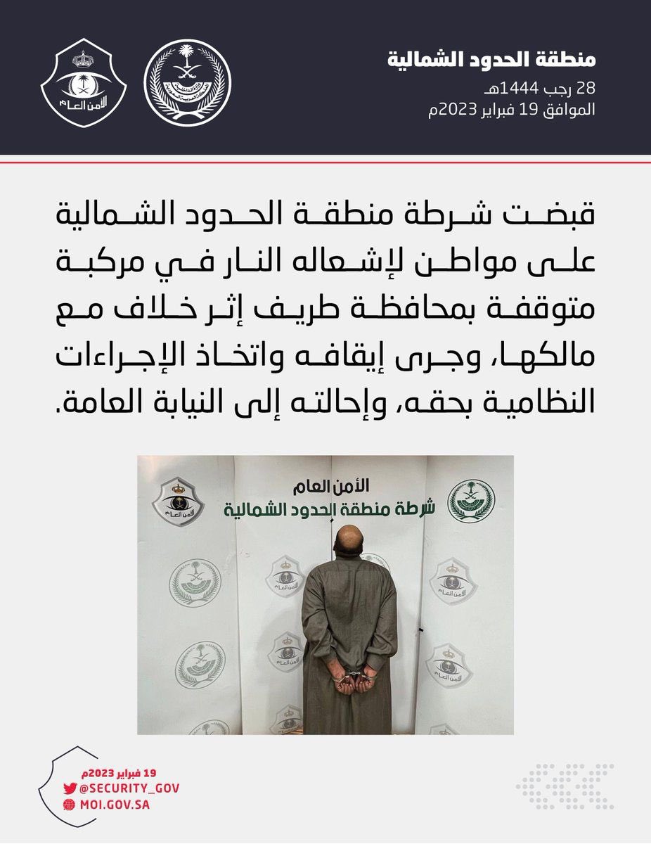 قبضت شرطة منطقة الحدود الشمالية في السعودية على مواطن بسبب اشعاله النار في مركبة متوقفة إثر خلاف مع صاحب السيارة.