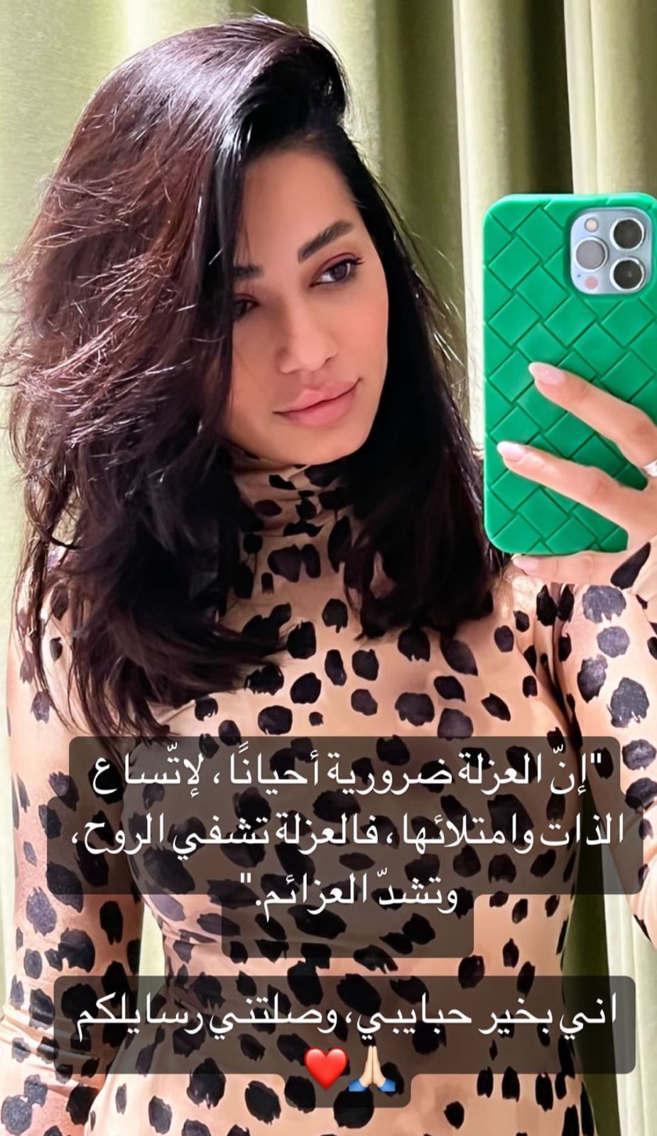 نشرت الفنان العراقية رحمة رياض صورة عبر خاصية الستوري عبر انستغرام قالت فيها :”ان العزلة ضرورية لاتساع الذات وامتلائها”.