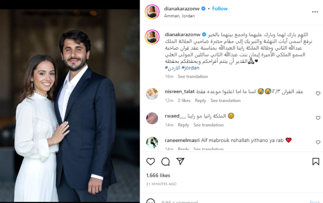 نشرت الفنانة الاردنية ديانا كرزون عبر انستغرام صورة لـ ابنة الملك عبدالله الثاني للأميرة ايمان والسيد جميل ألكسندر، أرفقتها بتهنئة للعائلة المالكة الهاشمية.