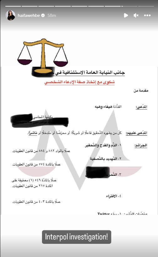 واظهرت الوثيقة ان المدعي هي الفنانة اللبنانية هيفاء وهبي والمدعي عليه كل من يظهره التحقيق فاعلا او شريكا او محرضا او متدخلا.