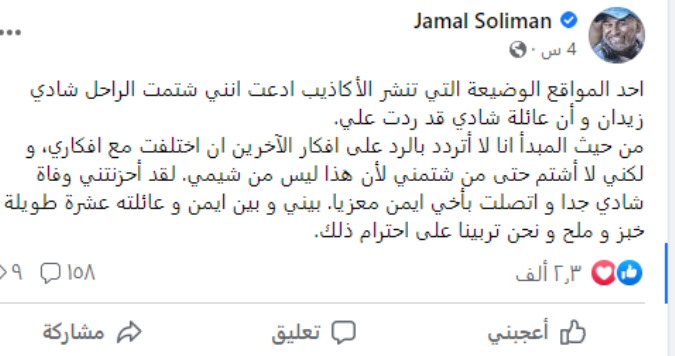 وقال في المنشور :”احد المواقع الوضيعة التي تنشر الأكاذيب ادعت انني شتمت الراحل شادي زيدان و أن عائلة شادي قد ردت علي، من حيث المبدأ انا لا أتردد بالرد على افكار الآخرين ان اختلفت مع افكاري، و لكني لا أشتم حتى من شتمني لأن هذا ليس من شيمي. لقد أحزنتني وفاة شادي جدا و اتصلت بأخي ايمن معزيا. بيني و بين ايمن و عائلته عشرة طويلة و خبز و ملح و نحن تربينا على احترام ذلك”.