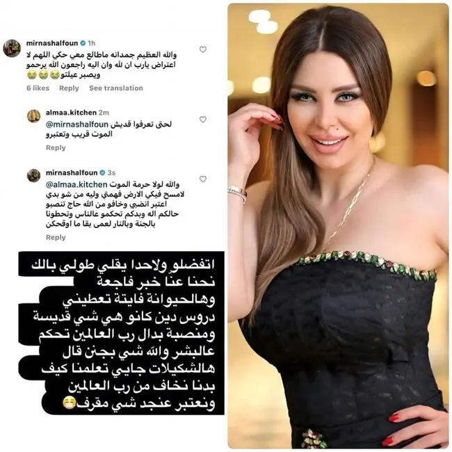 الا ان الفنانة السورية خرجت عن صمتها و كتبت قائلة : “والله لولا حرمة الموت لامسح فيكي الأرض فهمتي وليه من شو بدي اعتبر انضبي وخافو الله حاج تنصبر حالكم اله وبدكم تحكمو عالناس وتحطونا بالجنة وبالنار لعمى بقا ما أوقحكن”.