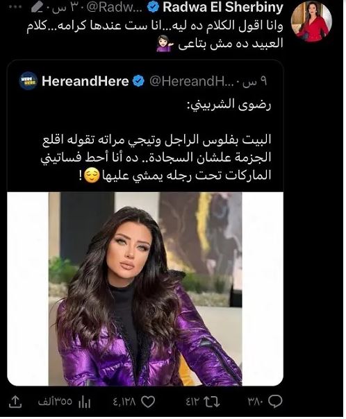 اذ أعادت رضوى الشربيني نشر صورة لأحد المنشورات على “تويتر” التي جاء فيها “البيت بفلوس الراجل وتيجي مراته تقوله اقلع الجزمة علشان السجادة.. ده أنا أحط فساتيني الماركات تحت رجله يمشي عليها”.