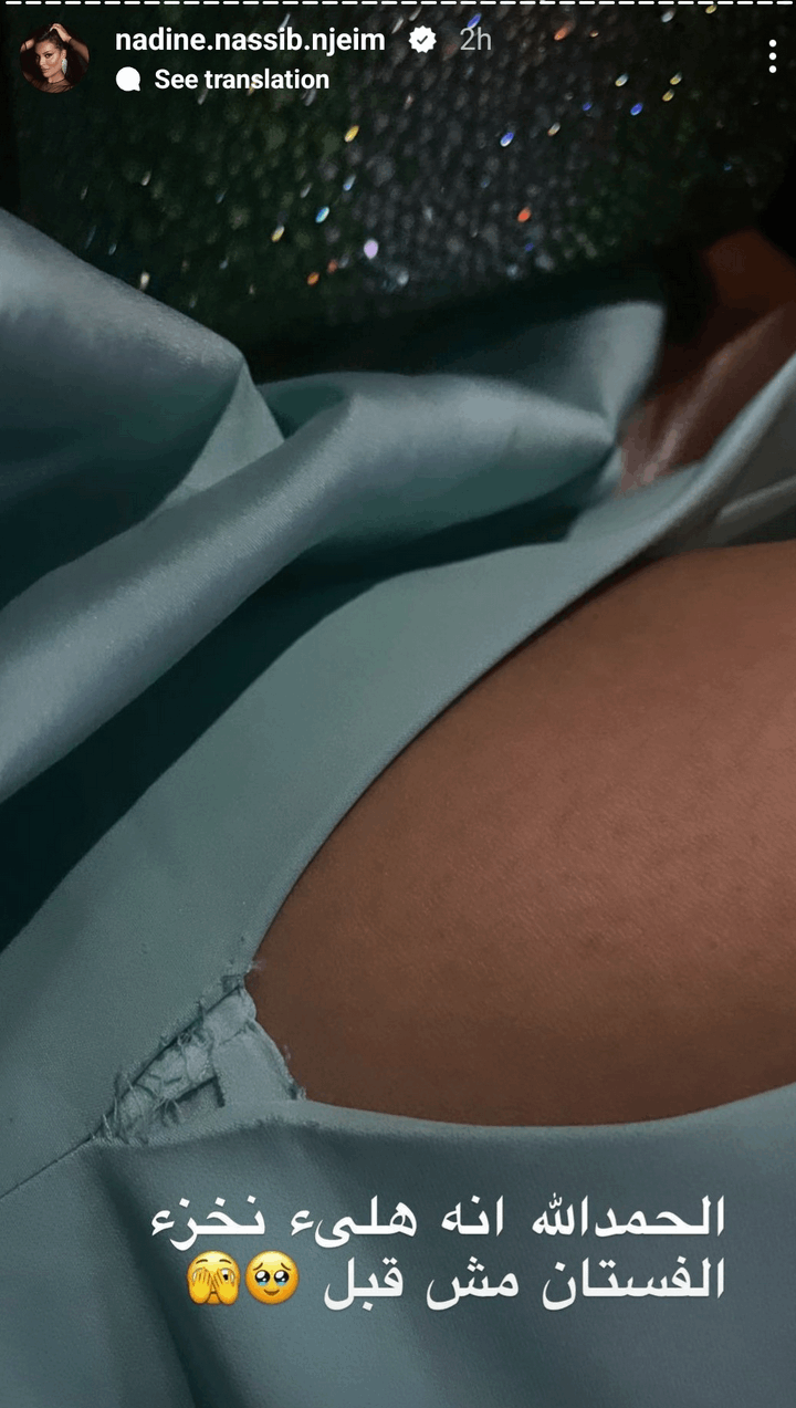 لتنشر لاحقا صورة عبر خاصية “الستوري” على انستغرام أشارت فيها إلى ان فستانها تمزق في نهاية الحفل.