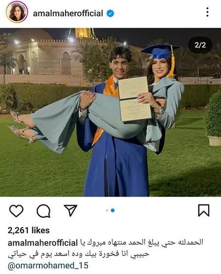 اذ نشرت آمال ماهر صورًا من حفل التخرج عبر “انستغرام” وعلقت قائلة: “الحمد لله حتى يبلغ الحمد منتهاه مبروك يا حبيبي أنا فخورة بيك ودا أسعد يوم في حياتي”.
