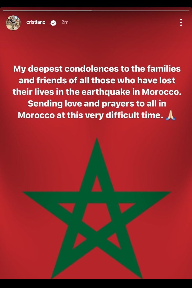 ونشر رونالدو ستوري عبر انستغرام جاء فيها بما معناه ” أتقدم بأحر التعازي لأسر وأصدقاء جميع الذين فقدوا أرواحهم في الزلزال الذي ضرب المغرب. أرسل حبي وصلواتي للجميع في المغرب في هذا الوقت العصيب ”