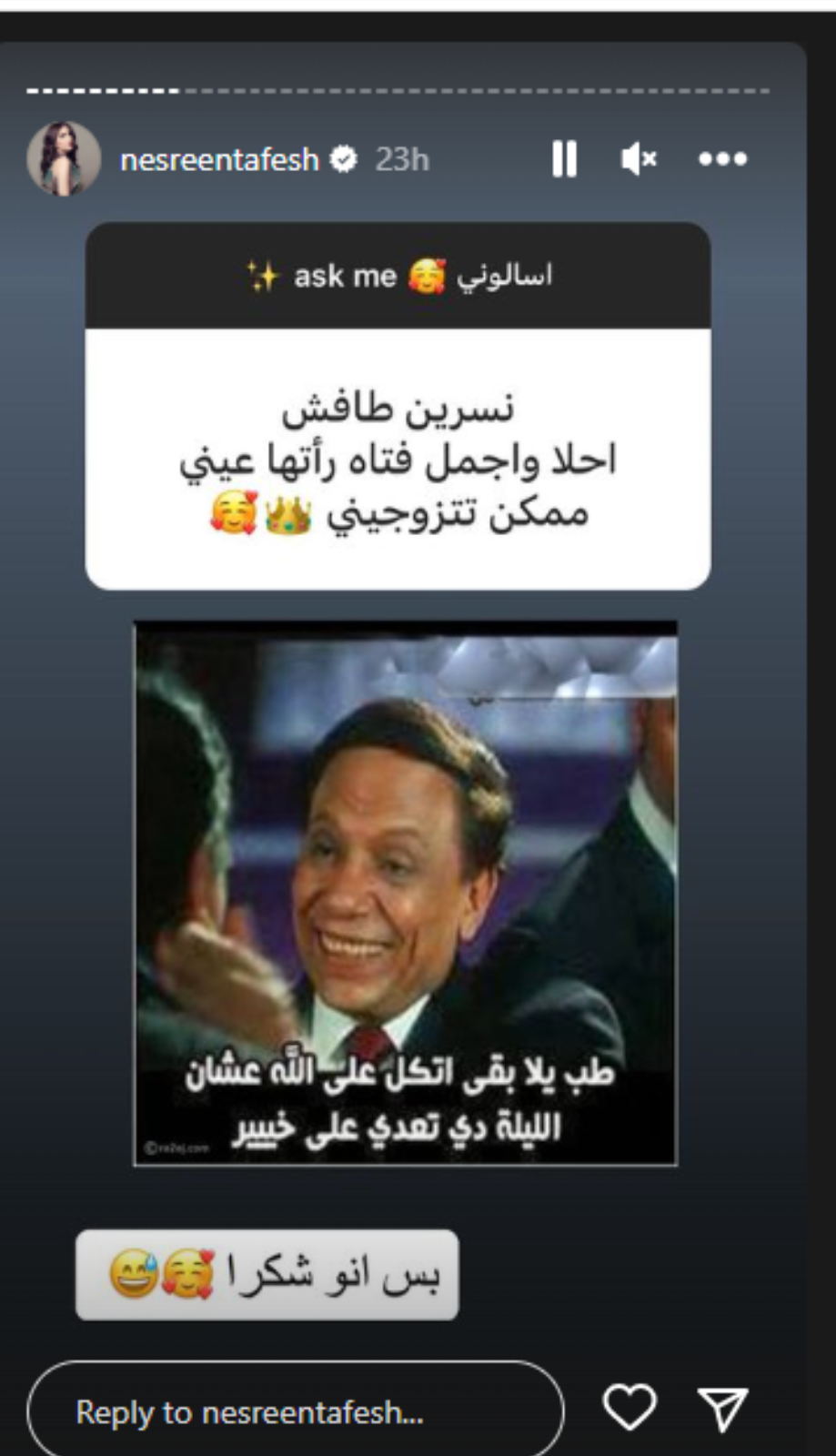 كما متابع آخر بطلب الزواج منها، قائلًا: “نسرين طافش أحلا وأجمل فتاة رأتها عيني ممكن تتزوجيني؟”.
