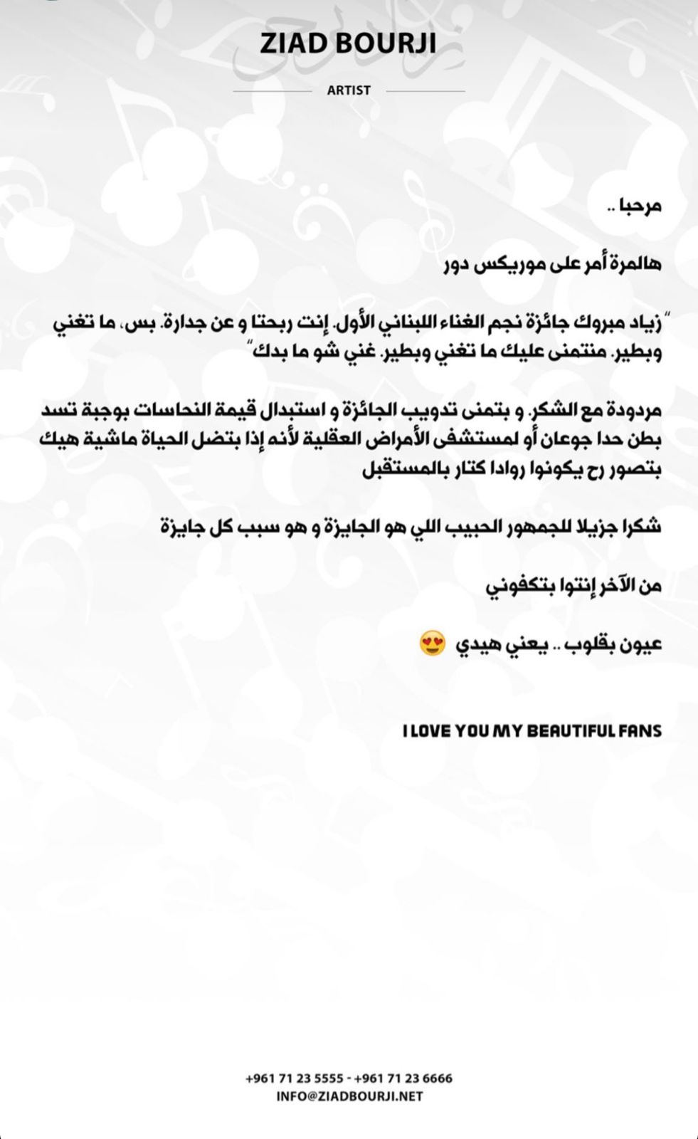 جاء في البيان: “مرحبا هالمرة أمر على موريكس دور. زياد مبروك جائزة نجم الغناء اللبناني الأول، إنت ربحتا وعن جدارة بس ما تغني “وبطير”.. منتمنى عليك ما تغني وبطير. غني شو ما بدك”.