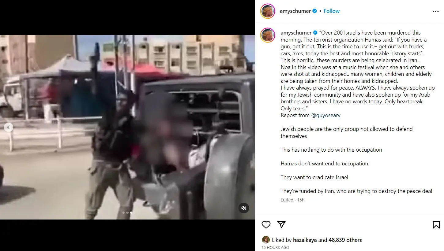 وفي التفاصيل نشرت الفنانة العالمية ايمي شومر صورة وفيديوهات من الأحداث الأخيرة في فلسطين وارفقه تعليق طويل يصف حركة حماس بـ “الإرهابية” وأن تمويلها من إيران.