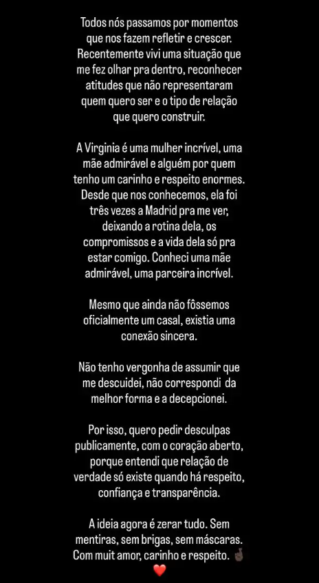 في بيان مطوّل عبر خاصية “الستوري” على حسابه في إنستغرام، عبّر فينيسيوس عن ندمه الشديد، واصفًا فيرجينيا بأنها “امرأة رائعة وأم مذهلة”، وأضاف: “أعترف بأنني كنت مقصرًا، ولم أتعامل معها كما تستحق، وأخلفت توقعاتها. لهذا أعتذر علنًا من قلبي، وأتمنى أن نبدأ من جديد، بلا أكاذيب أو خلافات أو أقنعة، فقط بالحب والاحترام”.