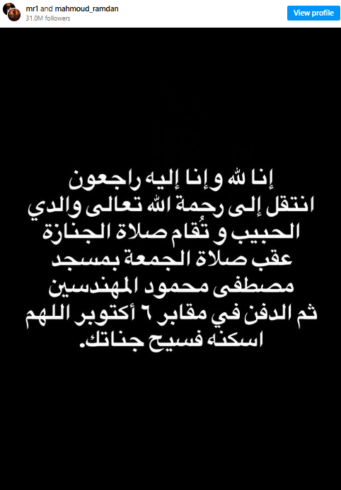 اللهم أسكنه فسيح جناتك”. وأرفق رمضان منشوره بصورة لوالده، ناعيًا إياه بكلمات مؤثرة قال فيها: “بعد فجر النهاردة يوم الجمعة 7 نوفمبر 2025 رجع أبويا الغالي إلى دار البقاء والمستقر.. ربنا يرحمه ويسكنه فسيح جناته هو وموتاكم جميعًا.. إنا لله وإنا إليه راجعون (1948 – 2025)”.