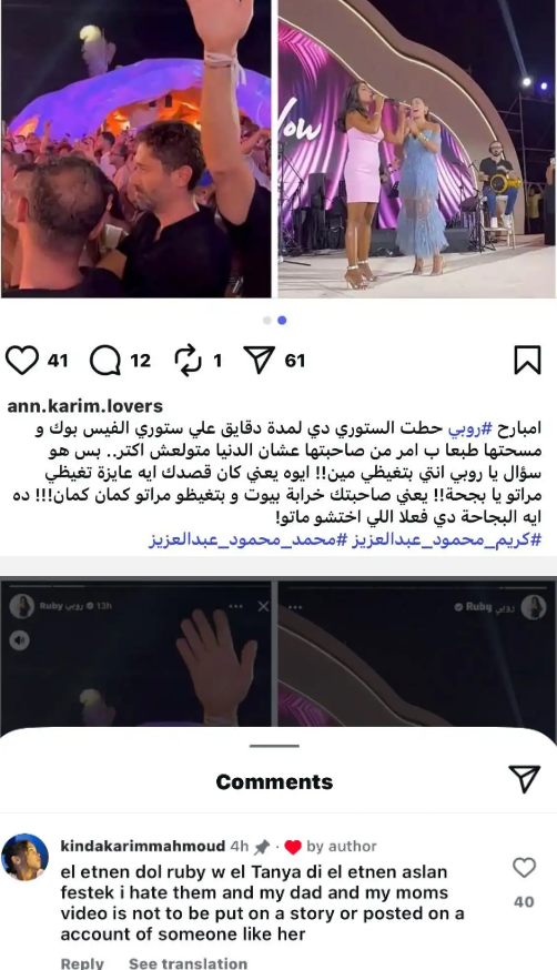 بدأت القصة مع انتشار شائعات عن علاقة تجمع بين دينا الشربيني ووالدها، ليتفاجأ المتابعون برد من كندة عبر أحد الحسابات جاء فيه: “اللي اسمها روبي والتانية دي، الاتنين دول فيستك وأنا بكرههم، وماما وبابا ما ينفعش تتجاب سيرتهم في بوستات”، في إشارة غامضة فهمها المتابعون على أنها هجوم على الفنانتين.