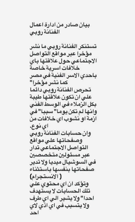 في المقابل، خرجت الفنانة روبي عن صمتها عبر بيان رسمي نشره مدير أعمالها إسلام صيام على “إنستغرام”، أكدت فيه استنكارها “لزج اسمها في خلافات عائلية لا تخصها”، مشددة على احترامها لجميع زملائها، وأن حساباتها الرسمية تُدار من قبل فريق متخصص لا يهاجم أحداً.