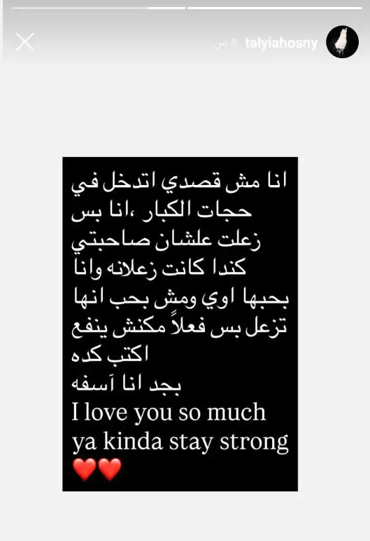 ولم تتوقف القضية عند هذا الحد، إذ نشرت كندة لاحقاً تعليقاً مع تاليا، ابنة الفنان تامر حسني، قالتا فيه: “إنها ساحرة”، ما اعتُبر تلميحاً جديداً نحو دينا الشربيني. وردّت تاليا بالتأكيد، قبل أن تعود وتعتذر عبر “إنستغرام” موضحة: “أنا مش قصدي أتدخل في حاجات الكبار، بس كنت زعلانه علشان صاحبتي كندة كانت زعلانه… بجد أنا آسفة”.