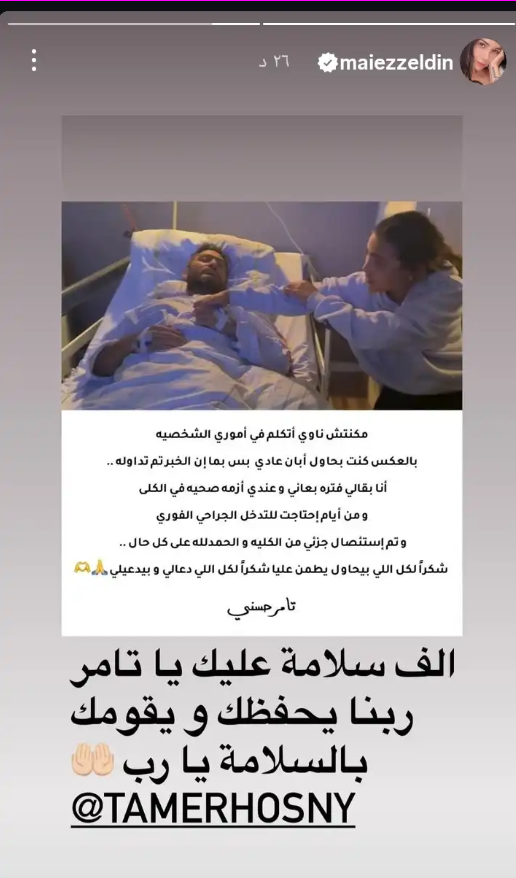 وكان تامر حسني قد خرج عن صمته بعد تداول أخبار مرضه، مؤكداً أنه يعاني منذ فترة من أزمة صحية في الكلى تطلّبت تدخلاً جراحياً سريعاً، موضحاً: “تم استئصال جزئي من الكلية والحمد لله على كل حال”. وأضاف أنه فضّل عدم الإعلان عن تفاصيل وضعه الصحي، لكنه قرر التوضيح احتراماً لجمهوره، موجهاً الشكر لكل من دعا له وسانده.