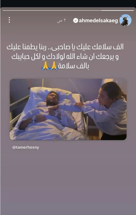 بدوره، شارك الفنان أحمد السقا الصورة نفسها عبر حسابه وكتب: “ألف سلامة يا صاحبي.. ربنا يطمّنا عليك ويرجعك لأولادك وحبايبك”.