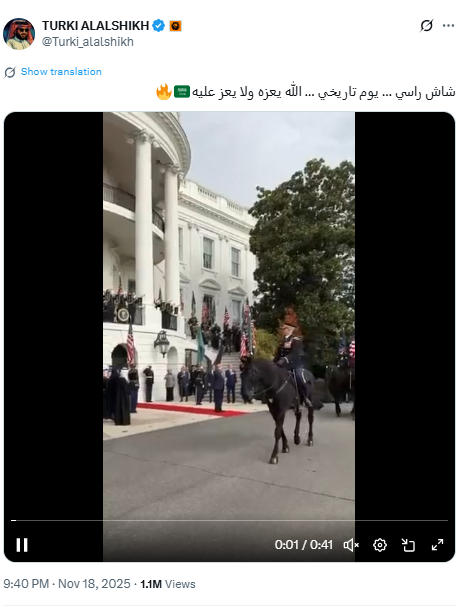 وكان لافتًا الحضور الخليجي المتفاعل مع الزيارة، إذ كتب المستشار تركي آل الشيخ تعليقًا قال فيه: “يوم تاريخي… الله يعزه ولا يعز عليه”، بينما نشرت الفنانة الإماراتية أحلام عبارة: “شبيه معزي. عز وفخر”.