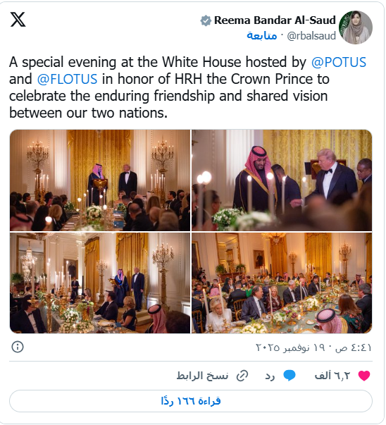كما شاركت الأميرة ريما بنت بندر صورًا من الأمسية الرسمية في البيت الأبيض، مؤكدة أنها جاءت “احتفاءً بالصداقة الممتدة والرؤية المشتركة بين البلدين”.