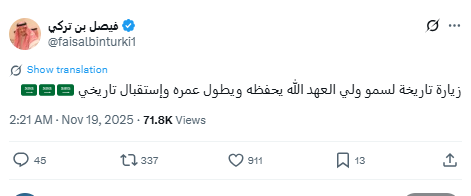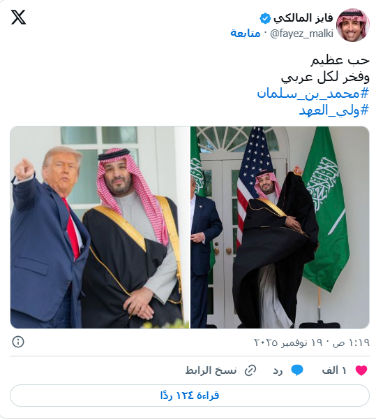 الفنان فايز المالكي هو الآخر اعتبر الزيارة “حبًا عظيمًا وفخرًا لكل عربي”، مشددًا على مكانة ولي العهد على المستوى الدولي.