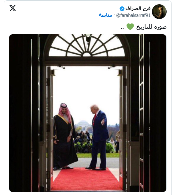 وأكدت الممثلة فرح الصراف أن الصورة التي جمعت ترامب وبن سلمان “صورة للتاريخ”.