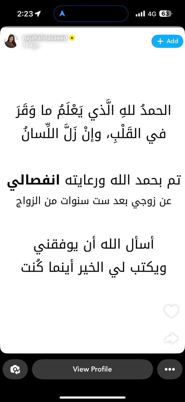 وأوضحت المساعيد في بيان مقتضب أن الانفصال تم بهدوء وتحت رعاية الله، معبرة عن قناعتها بأن الله مطّلع على ما في القلوب حتى وإن خان اللسان التعبير. واختتمت رسالتها بالدعاء أن يوفقها الله ويكتب لها الخير في محطتها المقبلة.
