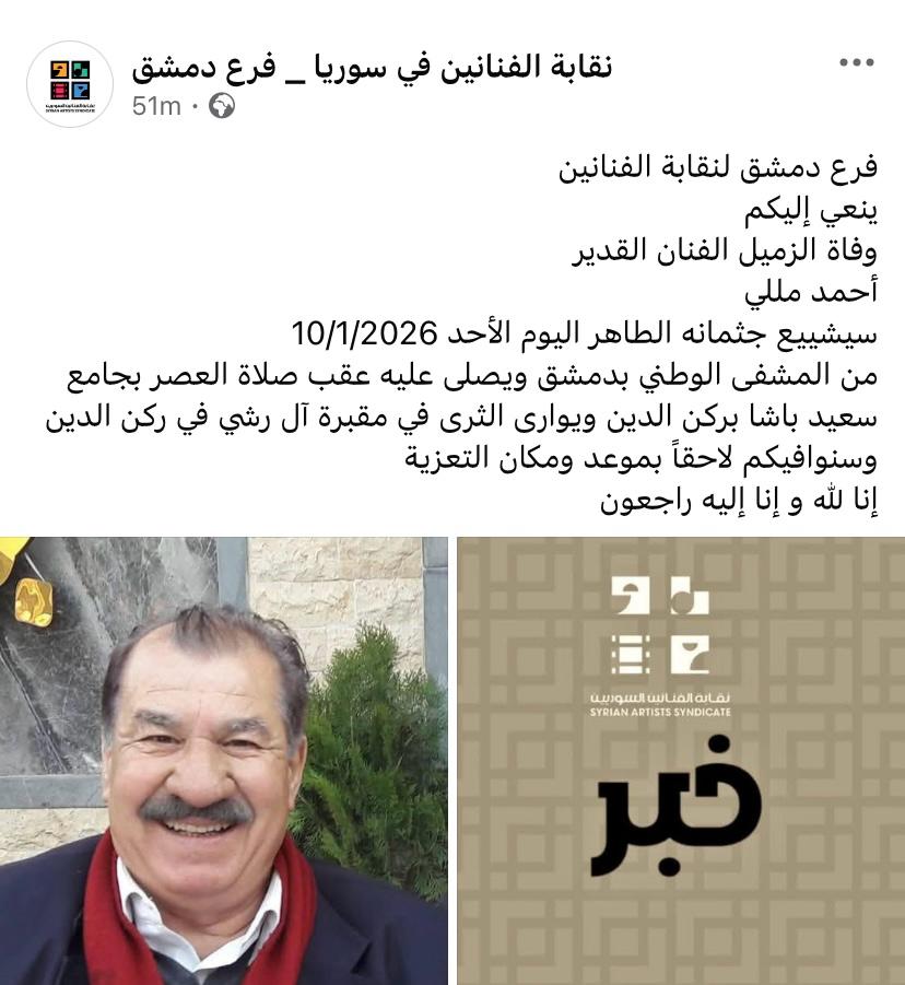 ودعت الساحة الفنية السورية صباح اليوم الأحد الفنان القدير أحمد مللي، الذي رحل عن عمر ناهز 80 عاماً، مخلفاً وراءه مسيرة حافلة بالعطاء الفني. وجاءت الوفاة نتيجة أزمة صحية طارئة استدعت نقله بشكل عاجل مساء أمس السبت إلى العناية المركزة في المشفى الوطني بدمشق، حيث فارق الحياة متأثراً بتدهور حالته الصحية المفاجئة.