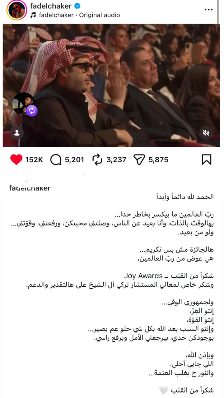 وعبر صفحته الرسمية على “إنستغرام”، شارك الفنان فضل شاكر جمهوره مقطع فيديو يوثق اللحظة التاريخية لإعلان فوزه بجائزتين مرموقتين خلال الحفل الذي أقيم يوم السبت الماضي 17 يناير ضمن فعاليات موسم الرياض، وأرفق الفيديو بكلمات نابعة من القلب قال فيها: “الحمد لله دائماً وأبداً.. ربّ العالمين ما بيكسر بخاطر حدا.. بهالوقت بالذات، وأنا بعيد عن الناس، وصلتني محبتكن، ورفعتني، وقوّتني.. ولو من بعيد”. هذه الكلمات عكست مدى اشتياق الفنان لجمهوره ومدى تأثير دعمهم المعنوي عليه في ظل ظروفه الحالية، مشدداً على أن هذه الجائزة تمثل له دافعاً معنوياً كبيراً وقوة استمدها من وفاء الناس الذين لم ينسوه يوماً.