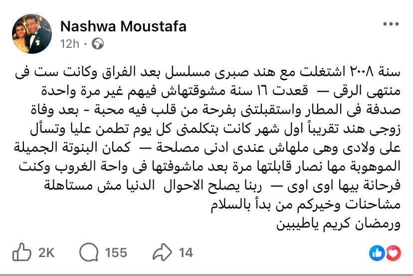 وعبر حسابها الرسمي على “فيسبوك”، كتبت نشوى منشوراً إنسانياً دعمت فيه هند صبري، مسترجعة ذكريات عملهما معاً في مسلسل “بعد الفراق” عام 2008، حيث وصفت هند بأنها إنسانة في منتهى الرقي، وأكدت أنها كانت أول من وقف بجانبها يومياً ولمدة شهر كامل بعد وفاة زوجها للاطمئنان عليها وعلى أولادها دون أي مصلحة شخصية. وفي الوقت ذاته، لم تغفل نشوى الإشادة بموهبة مها نصار، واصفة إياها بـ “البنوتة الجميلة الموهوبة”، وموجهة دعوة صريحة للصلح بقولها: “ربنا يصلح الأحوال الدنيا مش مستاهلة مشاحنات وخيركم من بدأ بالسلام”.
