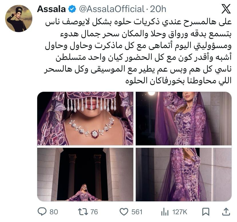 وظهرت أصالة على المسرح المفتوح، الذي يتميز بموقعه الفريد بين الجبال والبحر، بإطلالة أنيقة استوحتها من التراث الإماراتي، حيث ارتدت فستاناً مزيناً بالبرقع التقليدي. وشاركت لاحقاً صور الإطلالة عبر حسابها على إنستغرام، مرفقة بتعليق عبّرت فيه عن ارتباطها بالمكان وحبها لجمهور خورفكان، ووصفت الأجواء بالساحرة والمليئة بالهدوء والجمال.