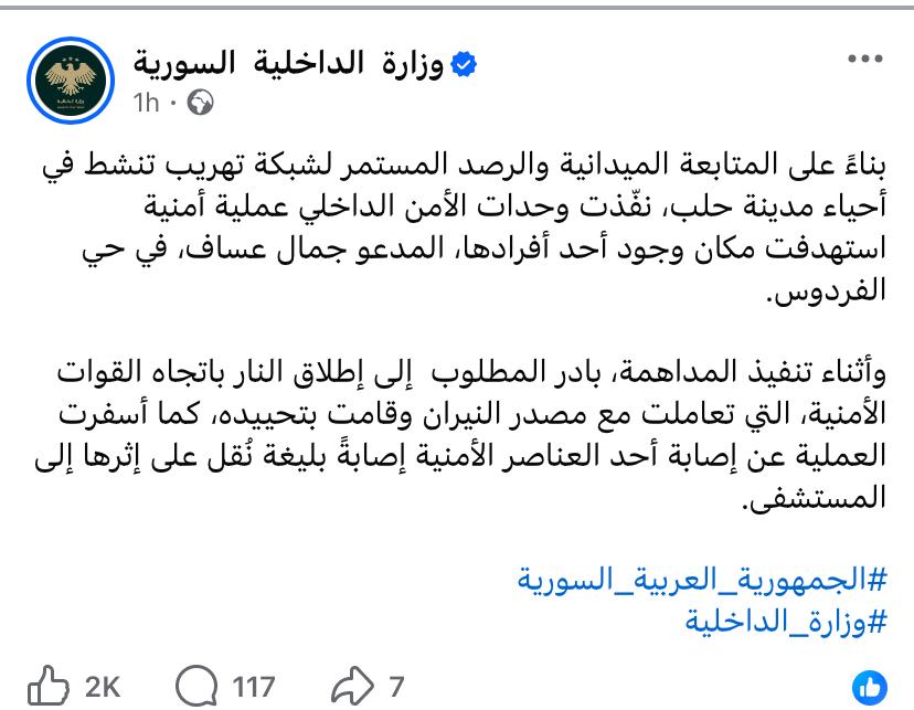 أعلنت وزارة الداخلية السورية، في بيان رسمي، أن قوى الأمن الداخلي نفذت عملية أمنية دقيقة استهدفت المدعو جمال عساف، الذي وصفته بأنه أحد أفراد “شبكة تهريب” تنشط في المنطقة. وأوضحت الوزارة في بيانها أن العملية التي جرت في حي الفردوس بمدينة حلب، تطورت إلى مواجهة مباشرة بعد أن بادر عساف بإطلاق النار تجاه القوات الأمنية خلال محاولة مداهمة مقر وجوده. وأكدت الوزارة أن القوات تعاملت مع مصدر النيران فوراً، مما أسفر عن مقتل عساف في تبادل لإطلاق النار، فيما أصيب أحد عناصر الأمن إصابة بليغة نُقل على إثرها إلى المستشفى لتلقي العلاج الطبي اللازم.