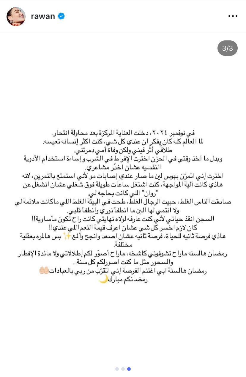 حيث كشفت روان أنها أُدخلت إلى العناية المركزة في نوفمبر 2024 إثر محاولة لإنهاء حياتها، مشيرة إلى أنها كانت تعيش صراعاً داخلياً قاسيًا في وقت كان فيه الجميع يعتقد أنها تملك كل مقومات النجاح والسعادة، موضحة أن طلاقها شكّل جرحاً عميقاً، إلا أن وفاة والدتها كانت الضربة الأقسى التي حطّمتها نفسياً.