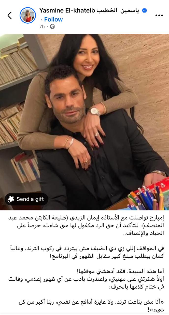 ياسمين الخطيب أوضحت أنها عرضت على إيمان حق الرد والظهور إعلامياً لتوضيح وجهة نظرها، خاصة وأن الكثيرين في مثل هذه المواقف يستغلون الفرصة “لركوب الترند” أو طلب مبالغ مالية كبيرة، لكن رد إيمان الزايدي كان مفاجئاً ومحترماً؛ حيث اعتذرت عن الظهور تماماً وقالت بوضوح: “أنا مش بتاعة ترند، ولا عايزة أدافع عن نفسي، ربنا أكبر من كل شيء”.
