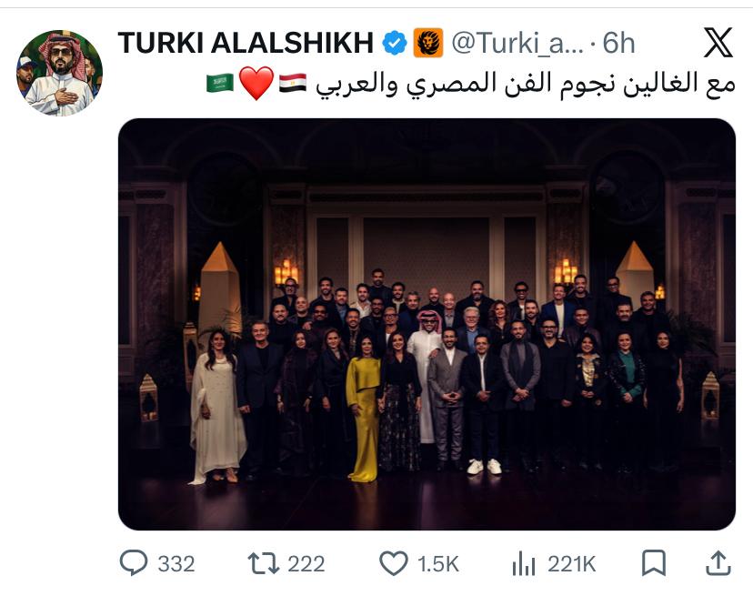 ونشر معالي المستشار تركي آل الشيخ عبر حسابه على منصة “اكس” صورة له رفقة نجوم الفن وعلق: “مع الغالين نجوم الموسيقى المصرية والعربية”.