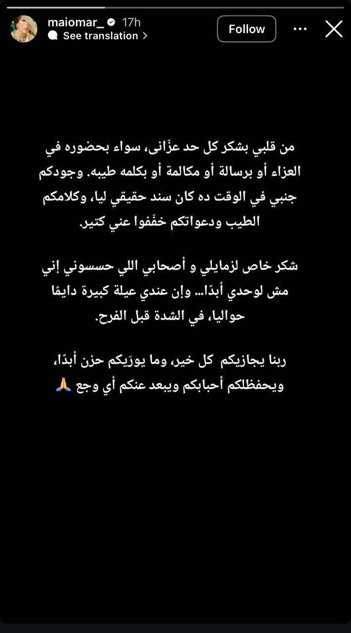في أول ظهور لها عقب انتهاء مراسم العزاء، وجهت الفنانة مي عمر رسالة شكر وامتنان لكل من ساندها في محنتها بوفاة والدها، حيث أكدت عبر حسابها الرسمي أن كلمات المواساة والحضور الصادق شكلا سنداً حقيقياً خفف عنها وطأة الألم. وأعربت مي عن تقديرها الخاص لزملائها في الوسط الفني الذين أشعروها بأنها محاطة بعائلة كبيرة تتكاتف في الشدائد قبل الأفراح، متمنية للجميع دوام الصحة وألا يفجعوا بآلام الفقد.