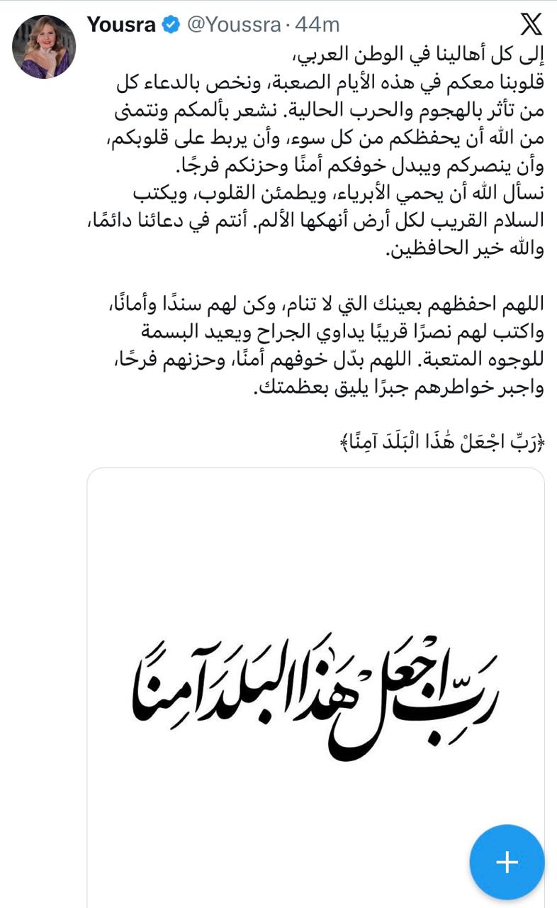 روان بن حسين والهام الفضالة ويسرا برسائل مؤثرة تضامنا مع دول الخليج