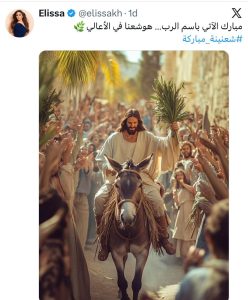 كما شاركت الفنانة إليسا صورة مرفقة بعبارة: “مبارك الآتي باسم الرب… هوشعنا في الأعالي”، بينما وجهت نانسي عجرم تهنئة قالت فيها: “شعنينة مباركة، إنشالله الفرح يسكن قلوبكن”.