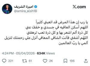 وفي وقت لاحق، عادت أميرة الشريف لتطمئن متابعيها، موضحةً أنها لا تزال تحت الرعاية الطبية داخل المستشفى، ومعتذرة عن عدم قدرتها على الرد على الكم الكبير من الرسائل بسبب وضعها الصحي، لكنها أكدت أن كل دعاء وصلها وكان له أثر كبير في التخفيف عنها ورفع معنوياتها.